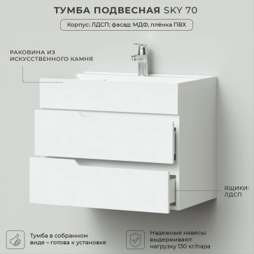 Комплект тумба Итана Sky 70 (600х450х560) подвесная, с раковиной Clarissa 70, белый глянец (CS00091693)
